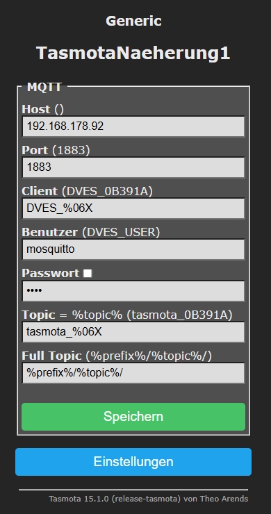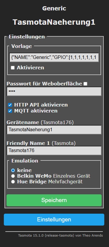 Unter Einstellungen kann man dem Gerät einen Namen geben ("Naeherung1"), den MQTT-Server von Homeassistant eintragen, die Pins des Wemos verwalten und vieles mehr. Drücken wir mal auf Einstellungen. Es erscheint ein weiteres Menü: