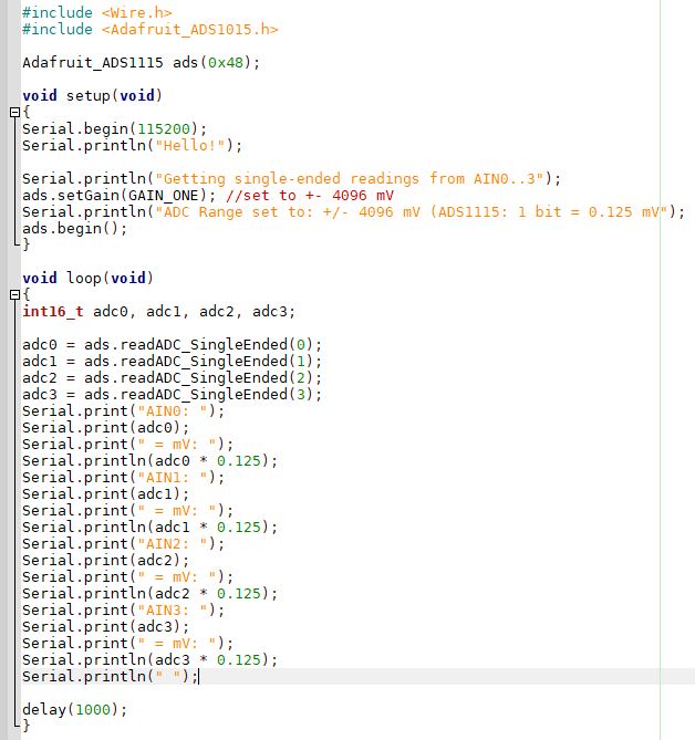 Standardmäßig ist der ADS1115 auf eine Verstärkung von 2/3 eingestellt, das bedeutet +/- 6.144V bei 16 bit Auflösung bedeutet +/- 0,1875mV pro Bit. Zum Messen von positiven Spannungen ist der Bereich 15 Bit somit + 0,1875mV pro Bit - logisch, da Bit 16 das Vorzeichen darstellt. Im Beispiel unten wird die Verstärkung auf 1x umgestellt.