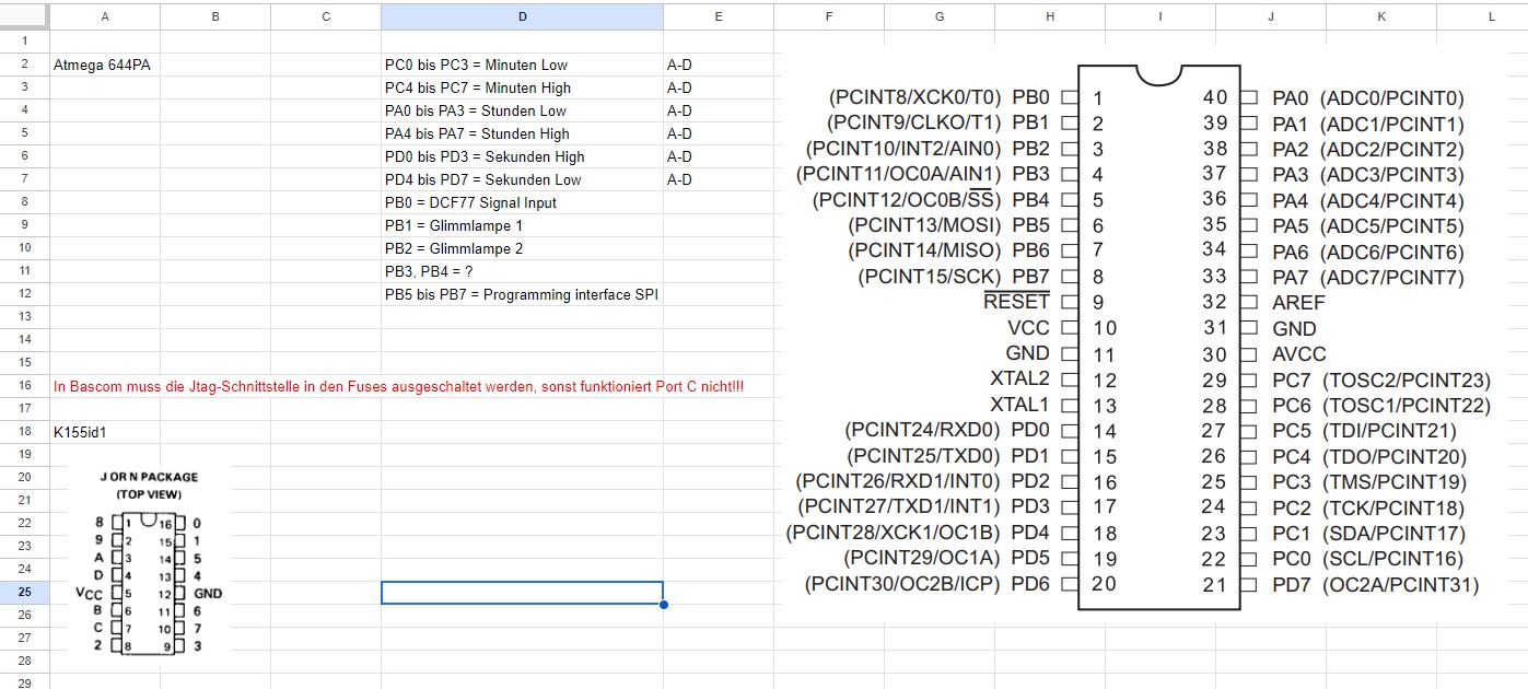 Zur Schaltung: Einen Schaltplan habe ich nicht gezeichnet. Das ist auch nicht nötig, denn das Prinzip der Ansteuerung ist für jede Ziffer gleicht: Jeweils vier Ports des Atmega644 führen zu einem BCD-Decoder K155id1. Der steuert jeweils einen von 10 Hochvolt - Ausgangstransistoren mit Open Collector an, die wiederum die Ziffern der Nixie-Röhre schalten, wie in Nixieuhr II beschrieben.
