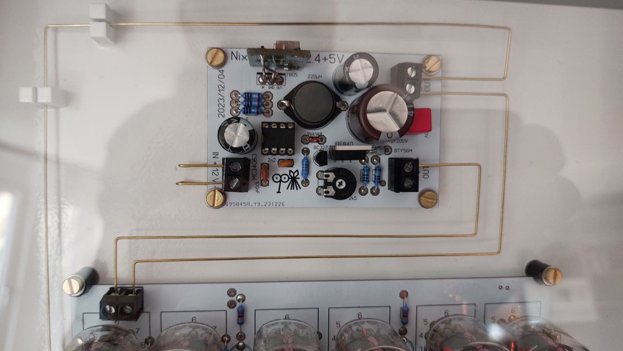 Versorgung mit 5V ist die selbe wie bei den anderen Nixie-Uhren auch. Lediglich den 7805 habe ich durch einen Schaltregler ersetzt, weil er sehr warm wurde.