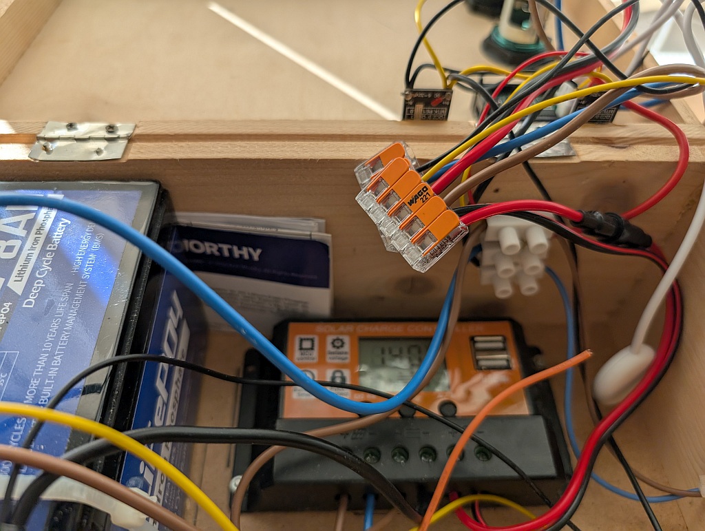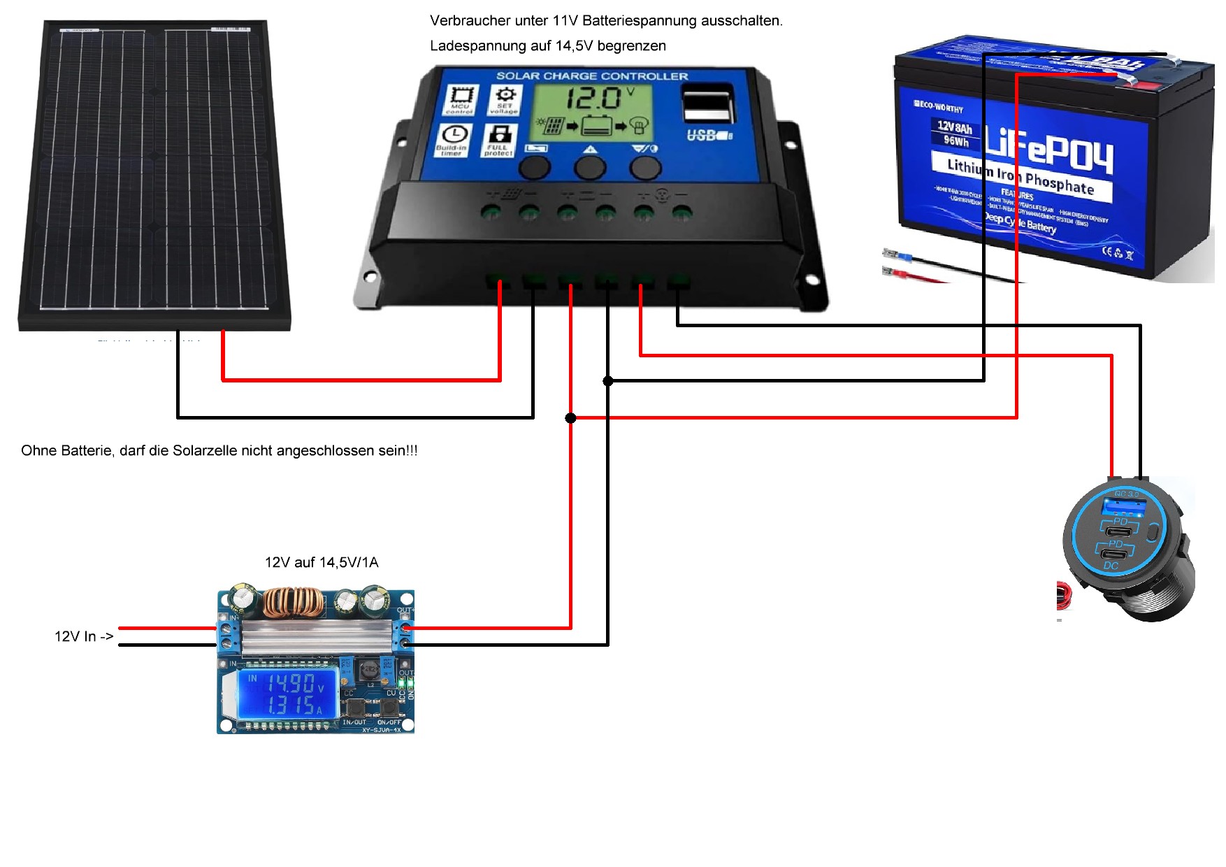 Besonders Wichtig: Der Solar-Regler sollte auf Ladeschlussspannung von 14,5V, sowie auf Entladeschlussspannung von 11,5V, besser 12V eingestellt werden. Ebenso der Boost-Converter auf 14,5V Ladeschlussspannung. Dann muss